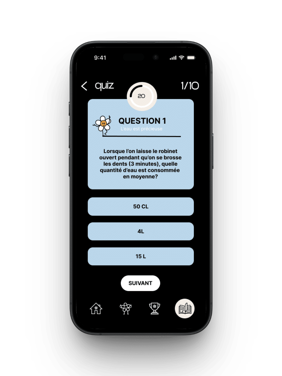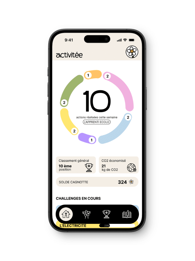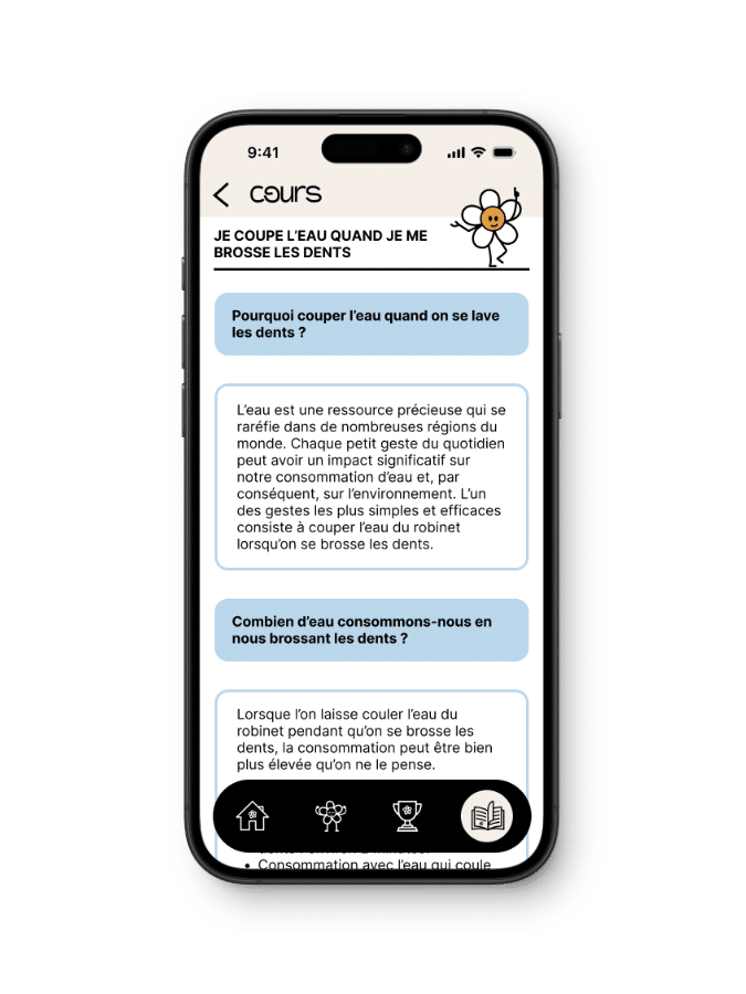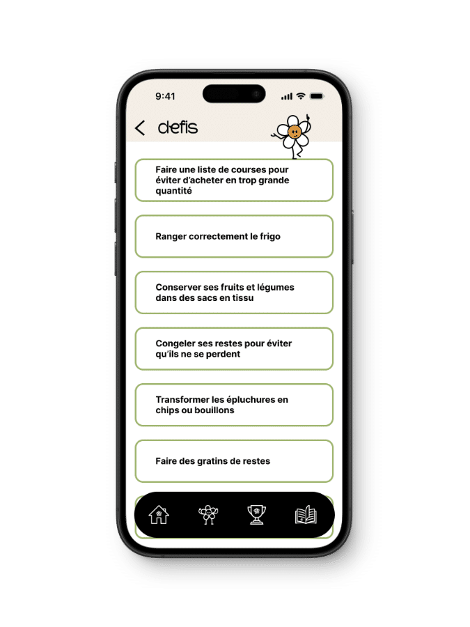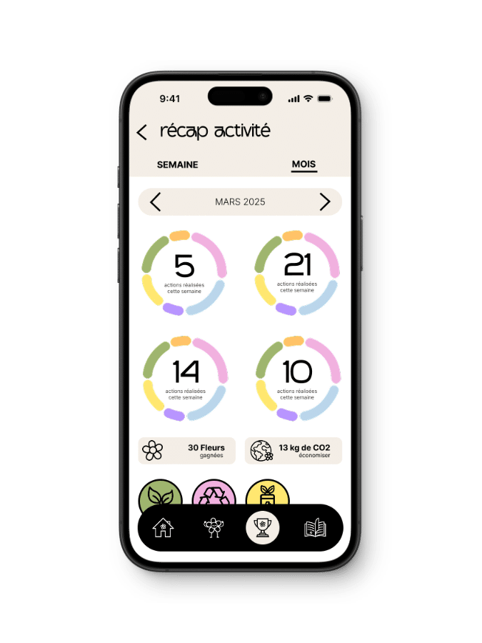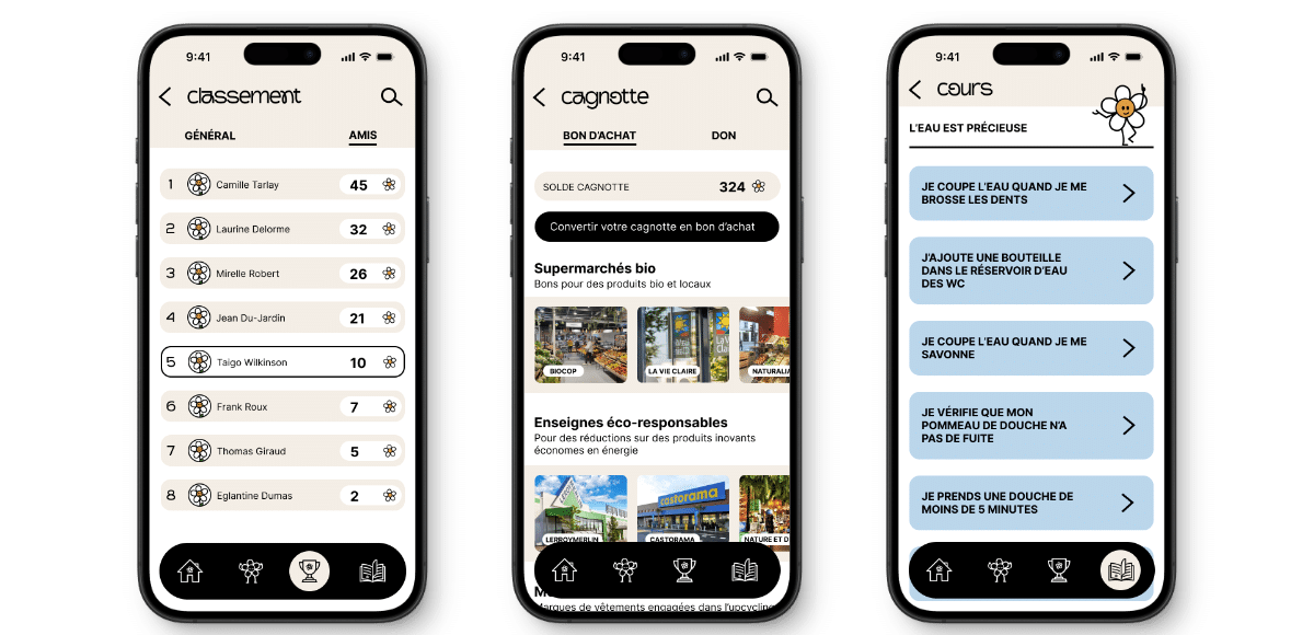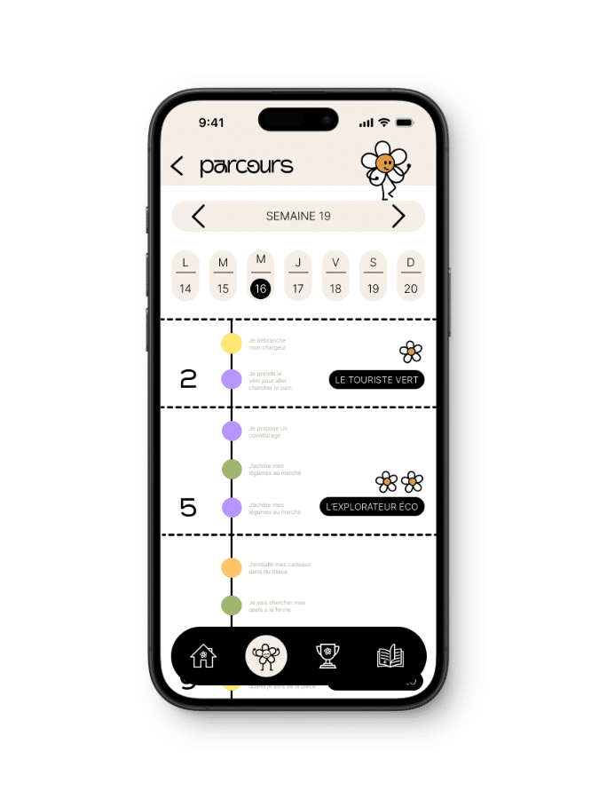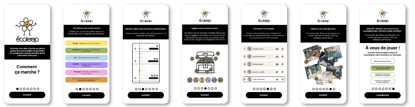 Ecoloop est une application que j’ai imaginée pour accompagner les utilisateurs dans leurs habitudes écologiques du quotidien. L’objectif est double : permettre à chacun de suivre ses actions pour rester motivé, tout en découvrant de nouvelles idées et en accédant à des contenus pédagogiques liés à ses choix. L’application valorise la progression personnelle et propose également une dimension comparative avec les autres utilisateurs. Le design, pensé comme ludique et immersif, installe un univers pédagogique stimulant, conçu pour encourager des comportements plus responsables de manière positive.