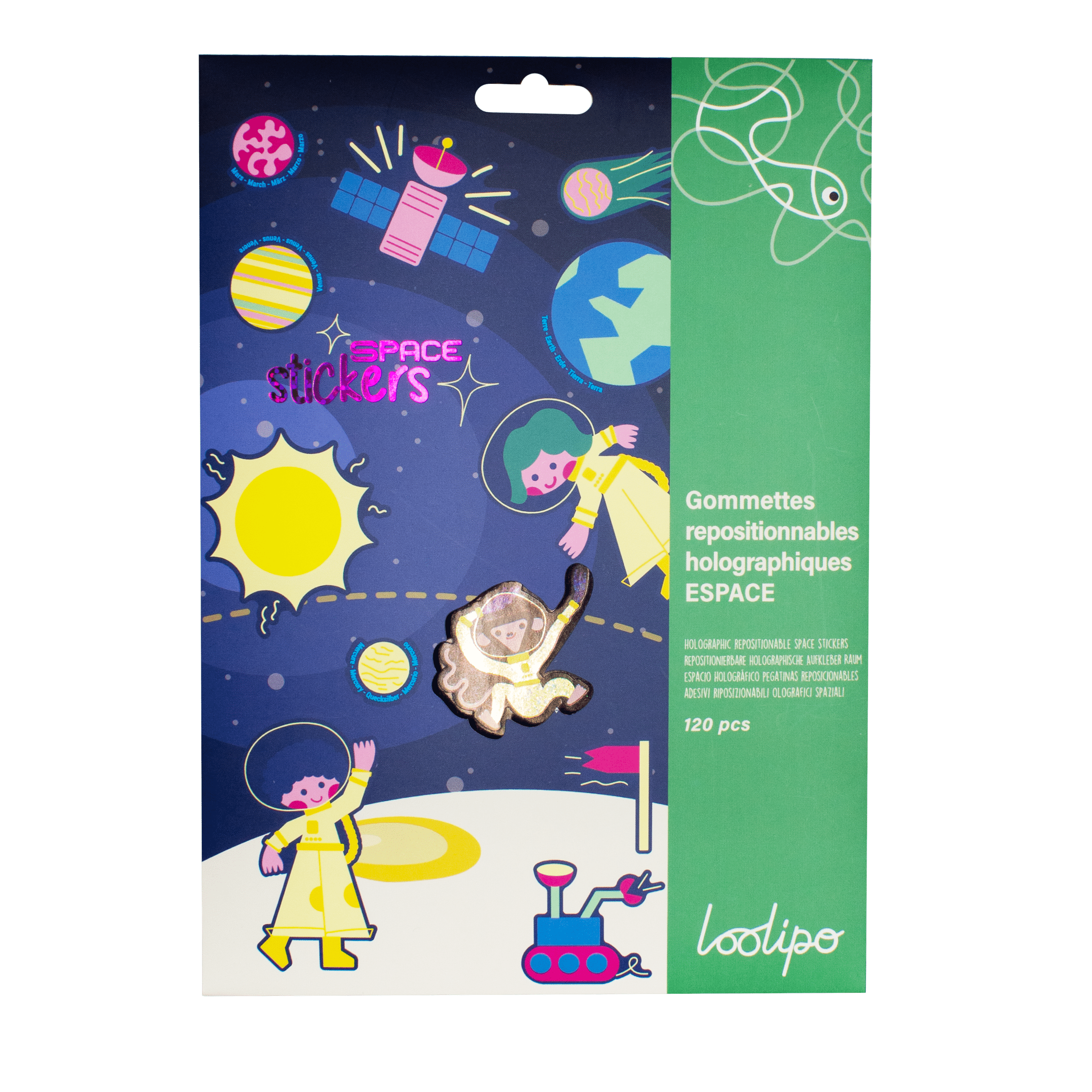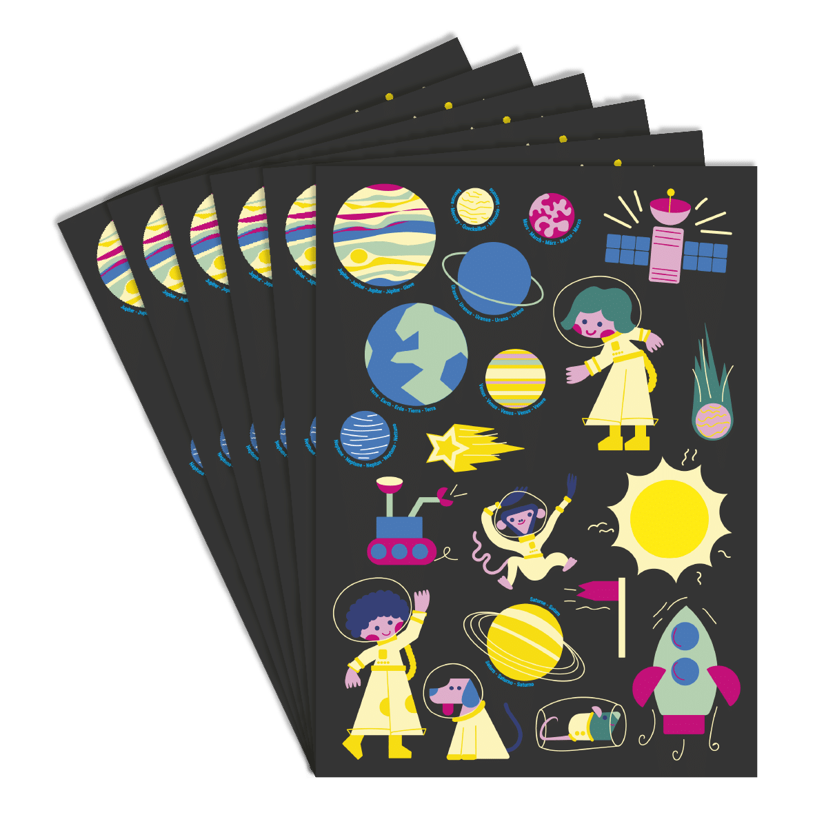 Ces gommettes sur le thème du système solaire ont été conçues pour permettre aux enfants de s’exercer à la manipulation tout en découvrant les planètes et leurs orbites autour du Soleil. Une scène permet de les placer au bon endroit, facilitant la compréhension du fonctionnement du système solaire. Des éléments liés à la conquête spatiale (fusées, animaux, drapeaux…) complètent l’ensemble pour encourager l’imagination et la narration.