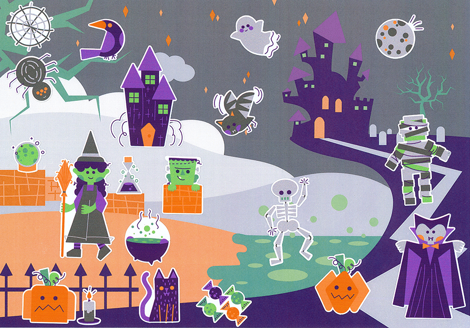 Ces gommettes, conçues autour de la thématique des occasions spéciales (halloween,  pâques..), s’inscrivent dans une gamme cohérente avec les planches moyens de transport et le système solaire. Elles sont accompagnées d’une scène illustrée qui permet à l’enfant de composer un mini-monde en plaçant librement les éléments, favorisant ainsi l’autonomie, l’imagination et la manipulation fine. Les designs ont été pensés pour être à la fois enfantins et stylisés.