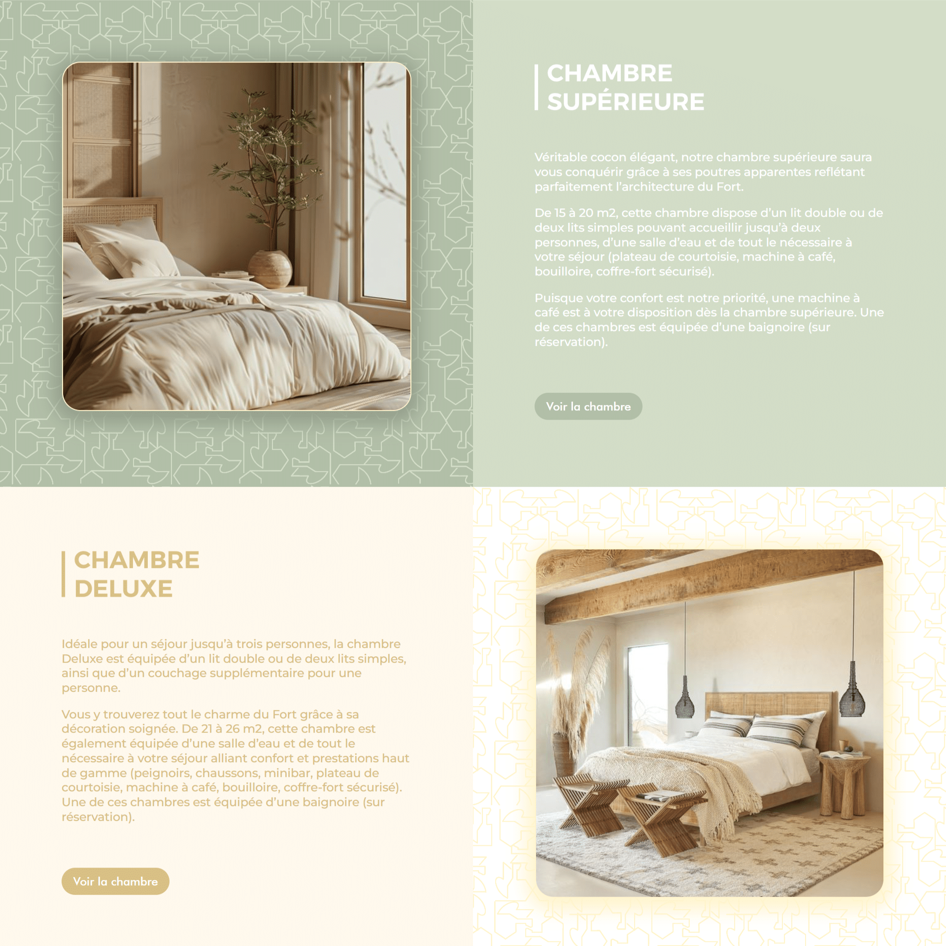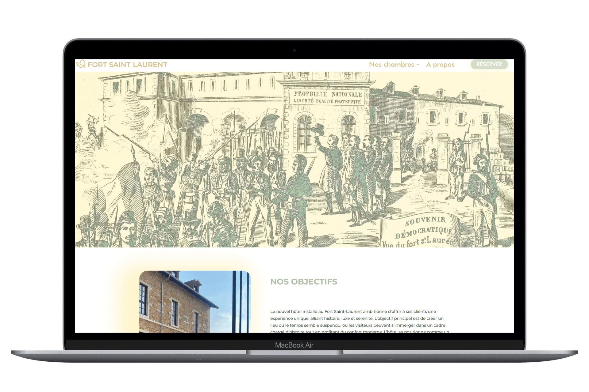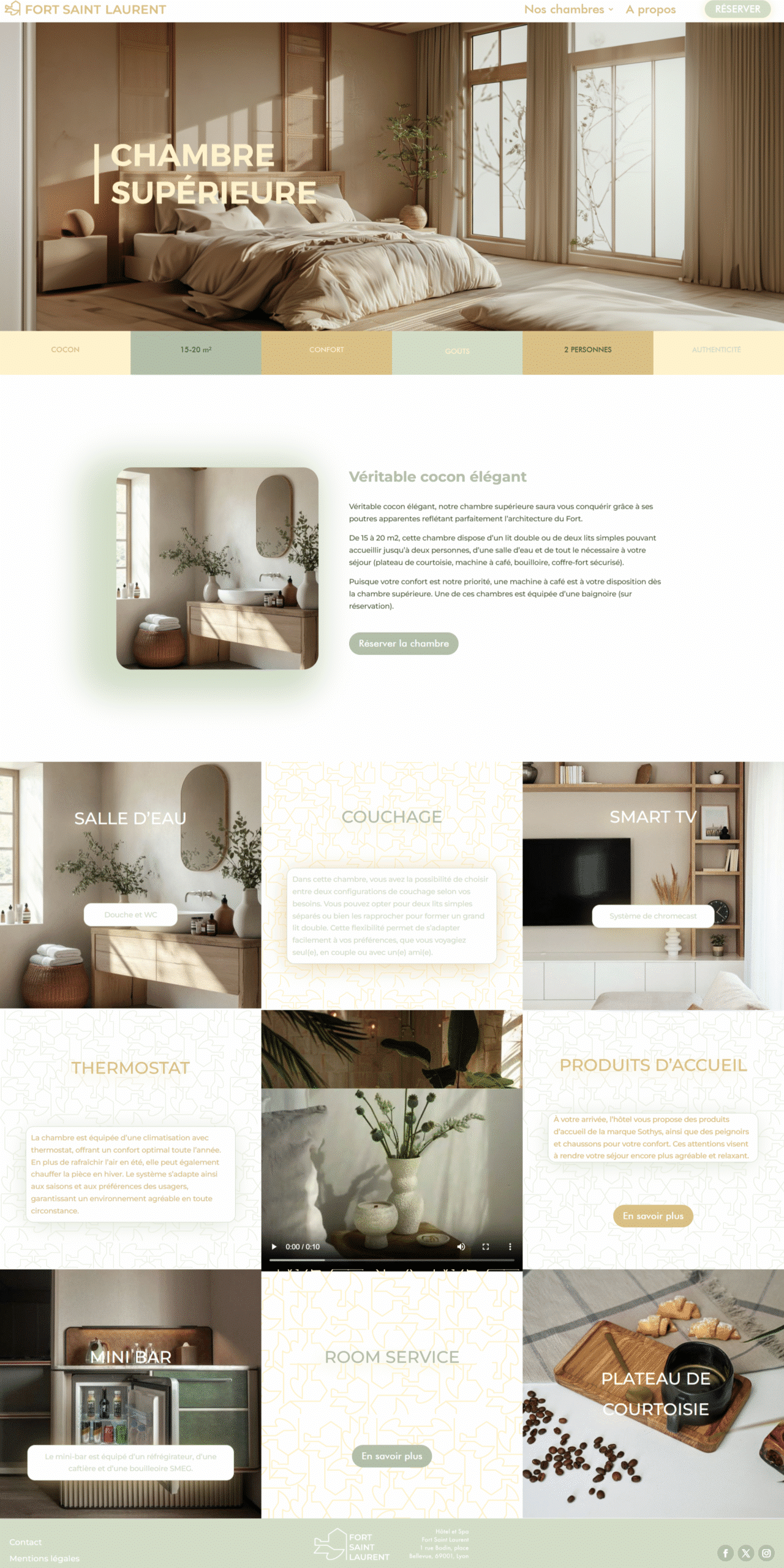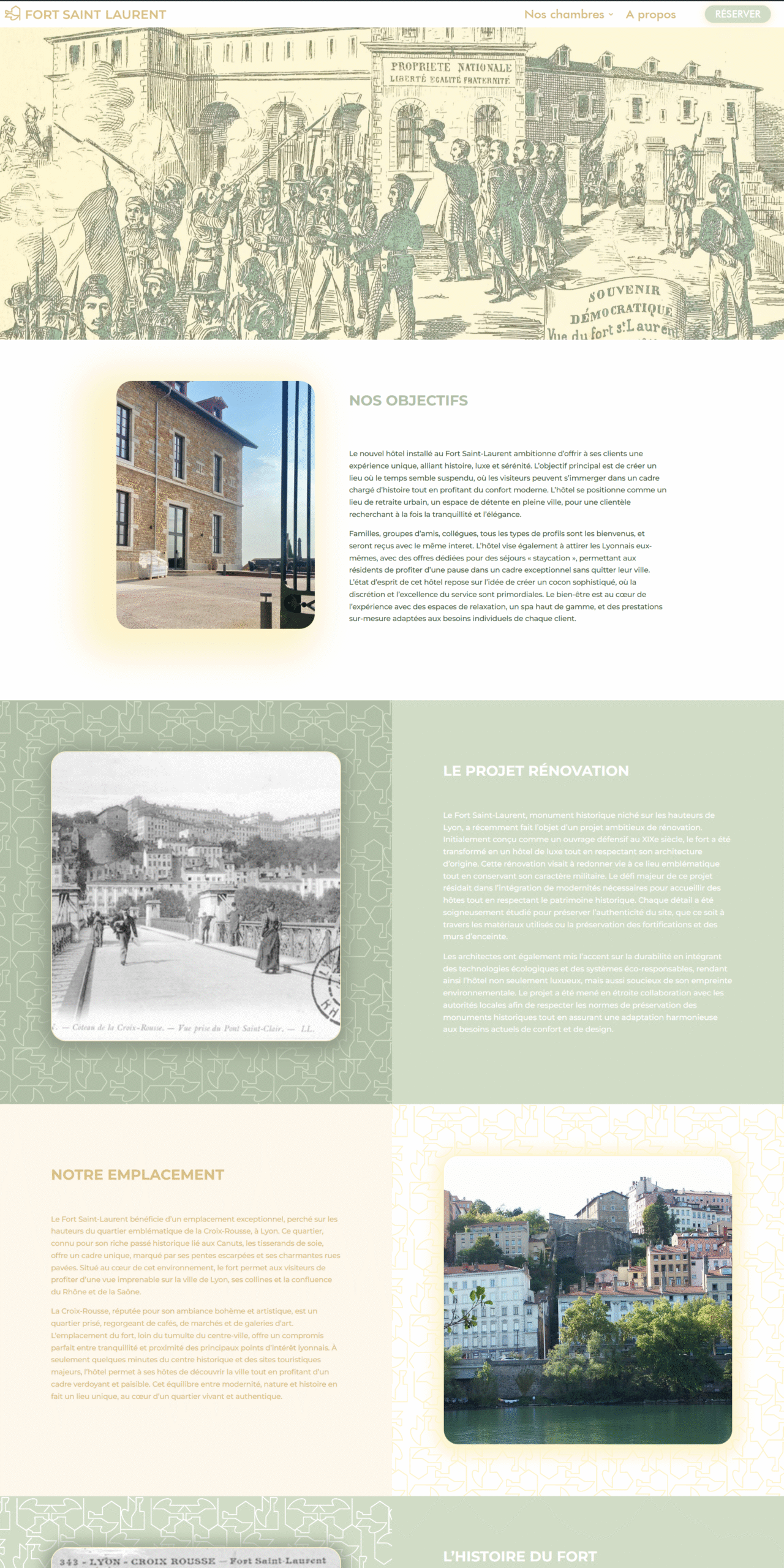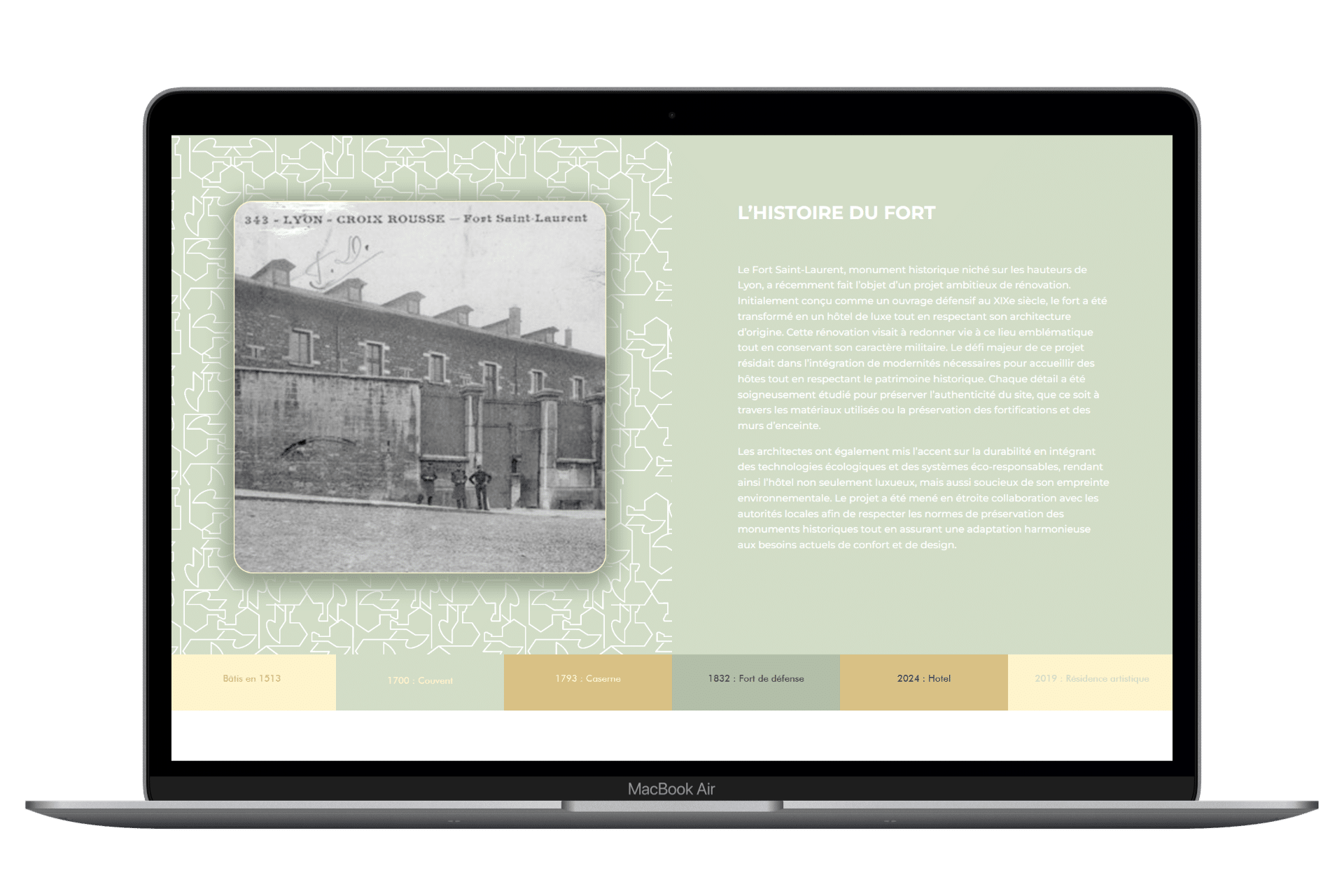 L’Hôtel Fort Saint-Laurent est un établissement 4 étoiles situé sur les pentes de la Croix-Rousse à Lyon, installé dans un ancien bastion militaire du XVIᵉ siècle. Pour la refonte de son site, j’ai cherché à préserver la richesse historique du lieu tout en lui apportant un regard contemporain.